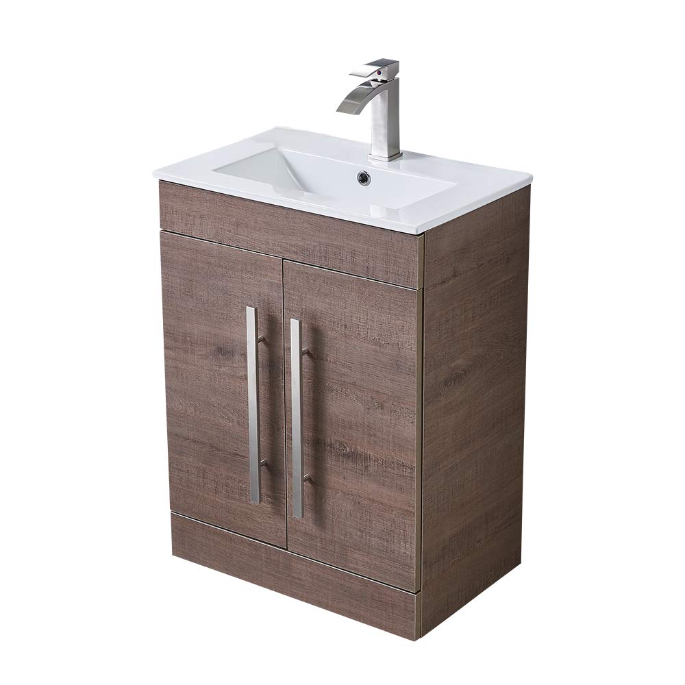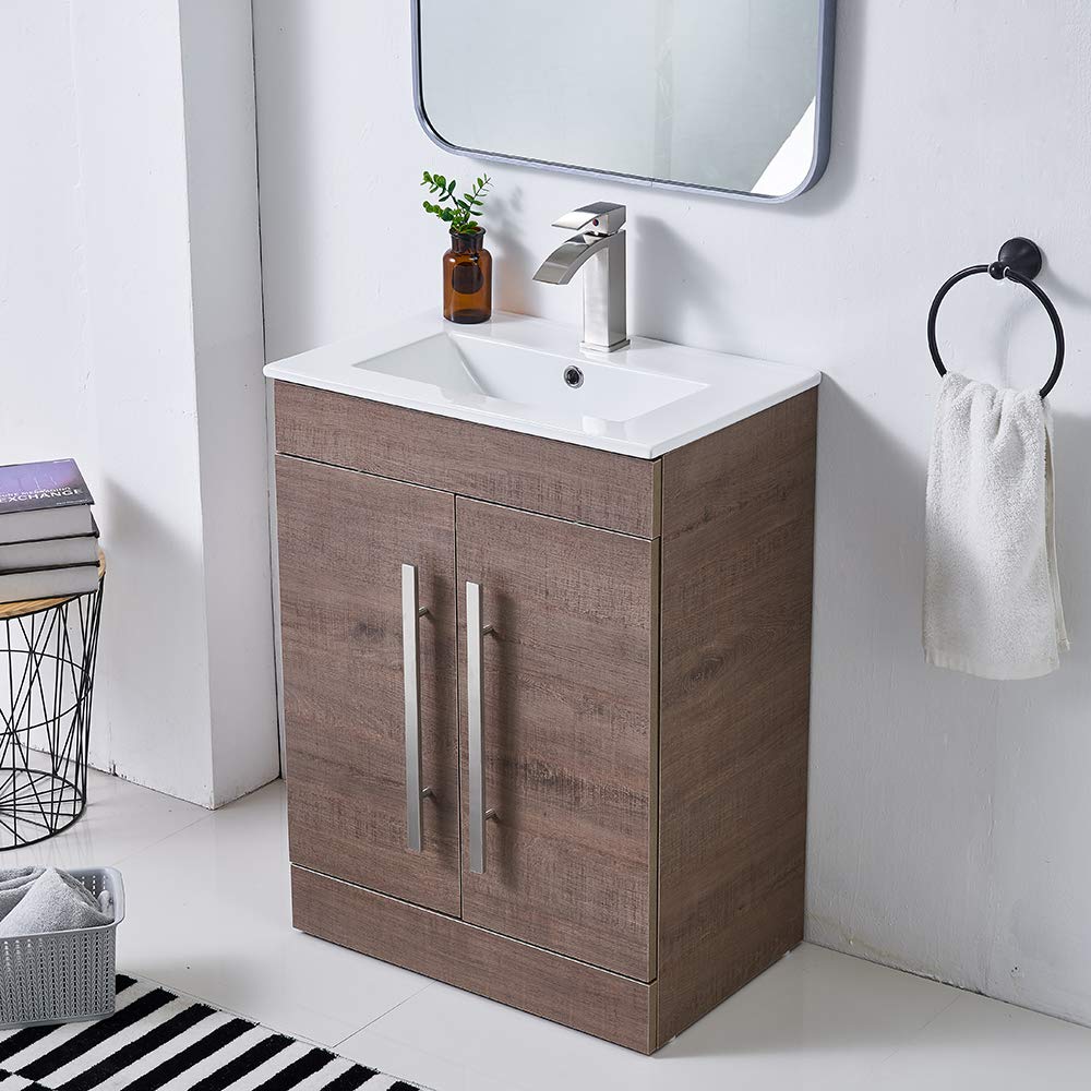 VESLA HOME Modern 24” Brown wood grain Stand Bathroom Vanity Sink Combo, 2 Door Bathroom Cabinet with Ceramic Vessel Sink