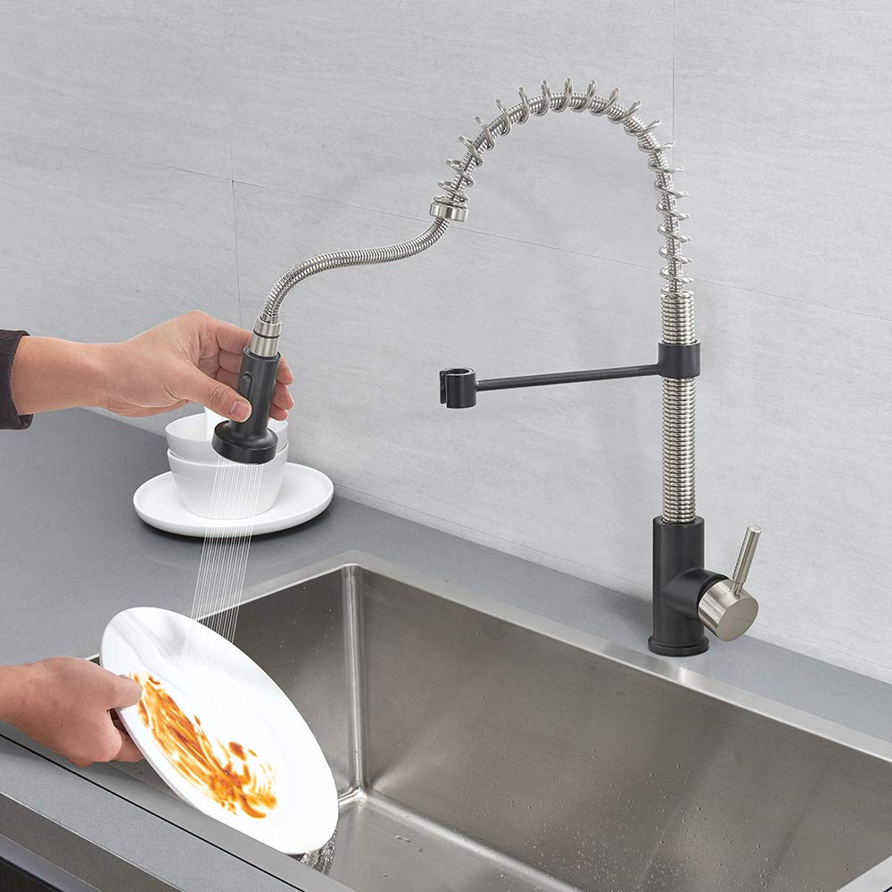 • VESLA HOME Commercial Single Handle Pull Out Sprayer Spring Stainless Steel Kitchen Faucet, Brushed Nickel and Matte Black Kitchen Sink Faucet